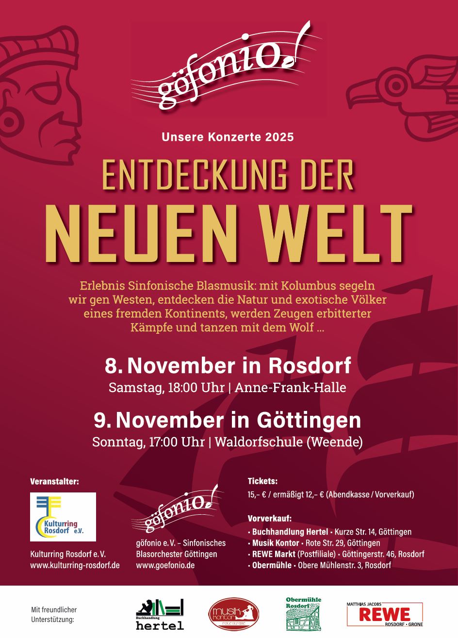 „Entdeckung der Neuen Welt“- unter diesem Motto steht 2025 das Konzert des sinfonischen Blasorchesters „göfonio“ aus Göttingen. Mit Kolumbus segeln wir 1492 jenseits vertrauter Küsten durch Sturm und raue See in neue Gefilde und Klangwelten. Wir erleben dort die Naturverbundenheit der Ureinwohner in ihrem Paradies. In die anfängliche Euphorie mischen sich bald andere Töne, wenn wir Zeugen der Zerstörung des Aztekenreiches werden. Eine Sinfonie erinnert an die Ureinwohner Nordamerikas, die um das Jahr 1830 in der Schlacht von Bad Axe am Mississippi Opfer eines Massakers wurden. Wir erfreuen uns aber auch an der Schönheit des mächtigen Grand Canyon, tanzen mit dem Wolf und lauschen einigen allseits bekannten Westernmelodien.